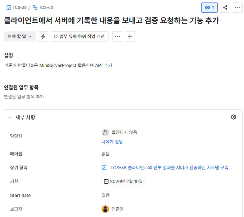 "클라이언트의 전투 결과를 서버가 검증하는 시스템 구축" Task와 하위 Task