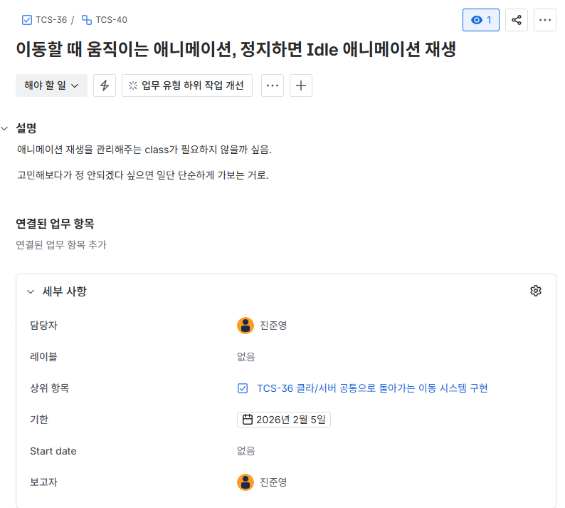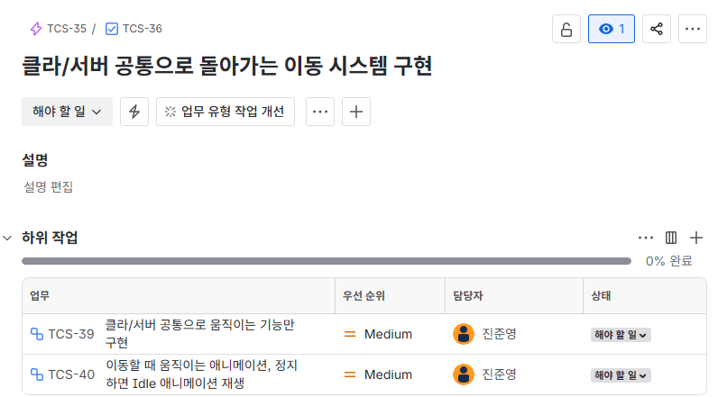 "클라/서버 공통으로 돌아가는 이동 시스템 구현" Task와 하위 Task