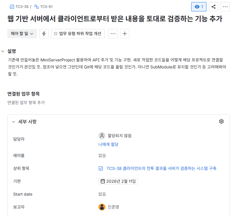 2월 11일 - "웹 기반 서버에서 클라이언트로부터 받은 내용을 토대로 검증하는 기능 추가" (현재 프로젝트와 기존 서버 프로젝트를 합치기)