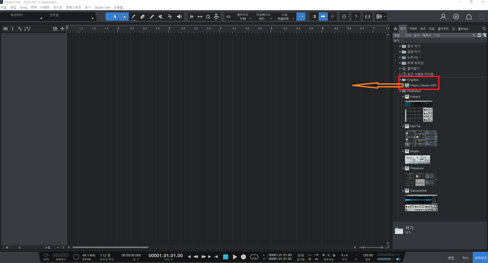 이후에 Crypton이라는 폴더 내의 Piapro Studio VSTi라는 악기를 드래그해서 옆으로 꺼내주면 된다.