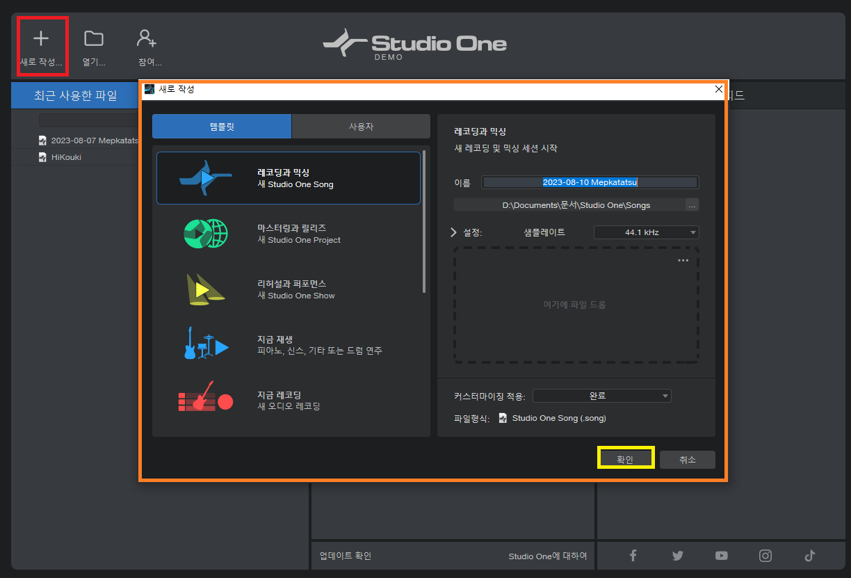 메인 화면에서 좌측 상단의 새로 작성을 누르고, 레코딩과 믹싱 그대로 확인을 눌러주면 새로운 프로젝트가 생성된다.