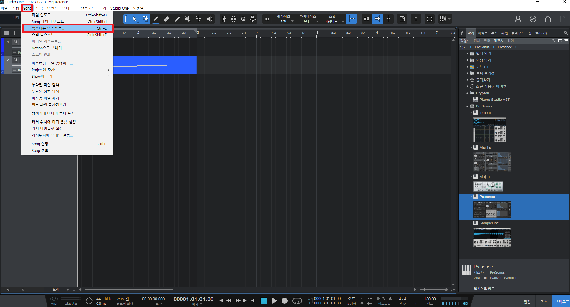 그 다음 Song의 믹스다운 익스포트를 눌러주면 창이 뜬다.