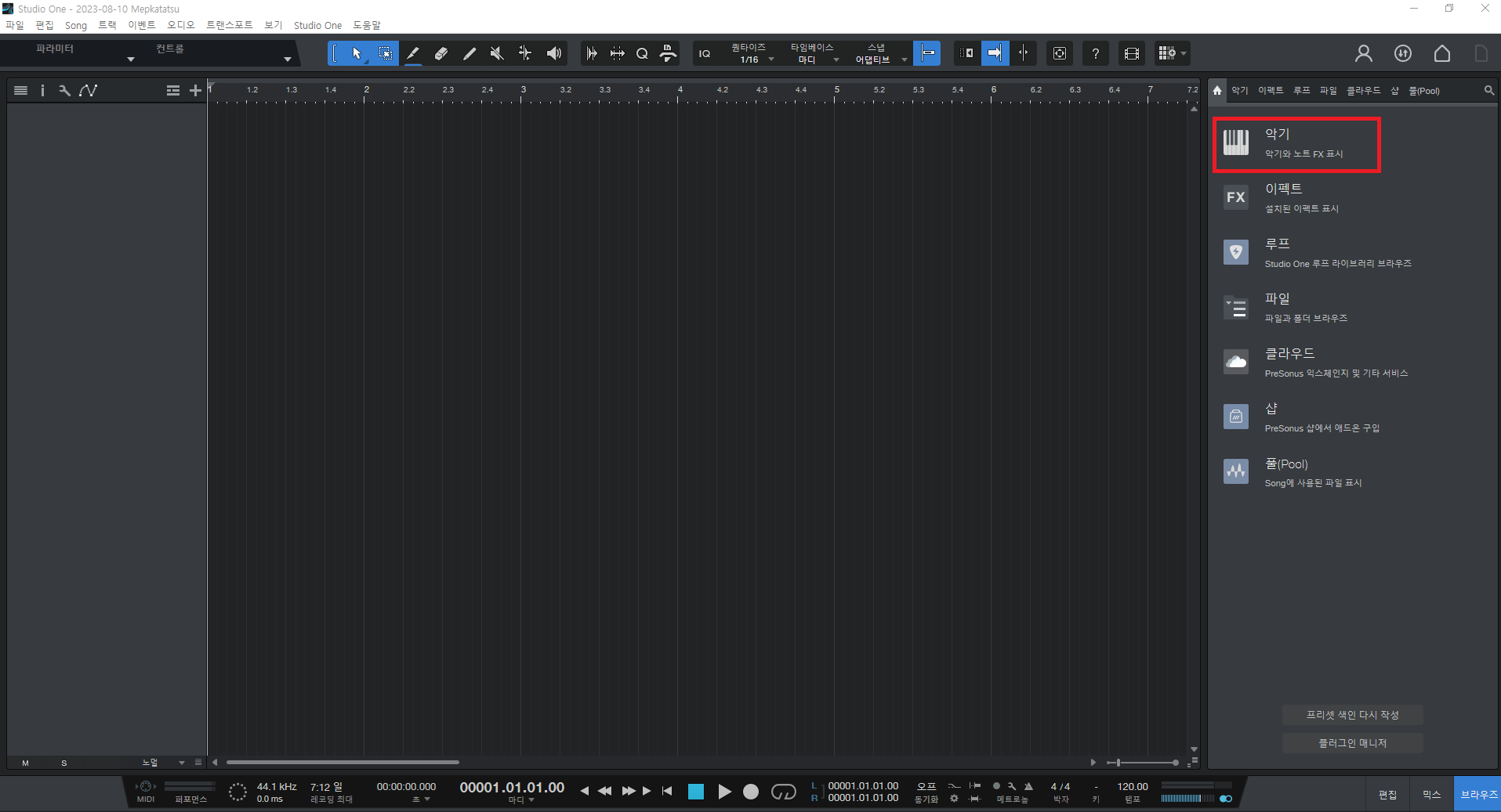 Studio One을 처음 켜면 이것저것 설치하라고 하는데, 그것들을 설치해주면 메인 화면이 나타난다.